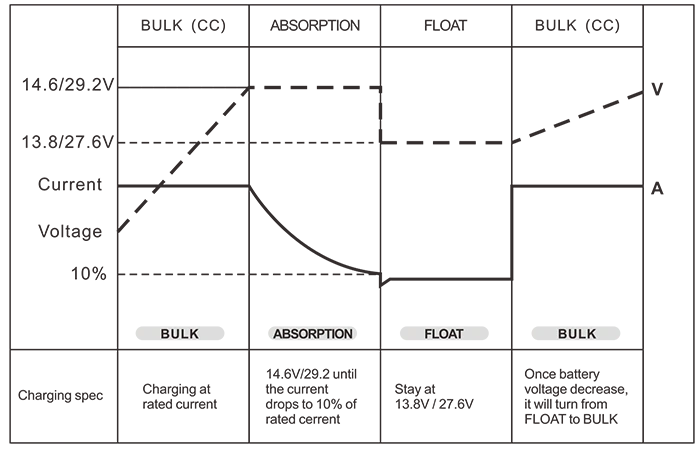 బ్యాటరీ నియంత్రణ (3-దశల బ్యాటరీ ఛార్జర్‌లు) బల్క్ / శోషణ / ఫ్లోట్