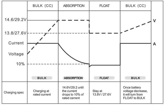 బ్యాటరీ నియంత్రణ (3-దశల బ్యాటరీ ఛార్జర్‌లు) బల్క్ / శోషణ / ఫ్లోట్